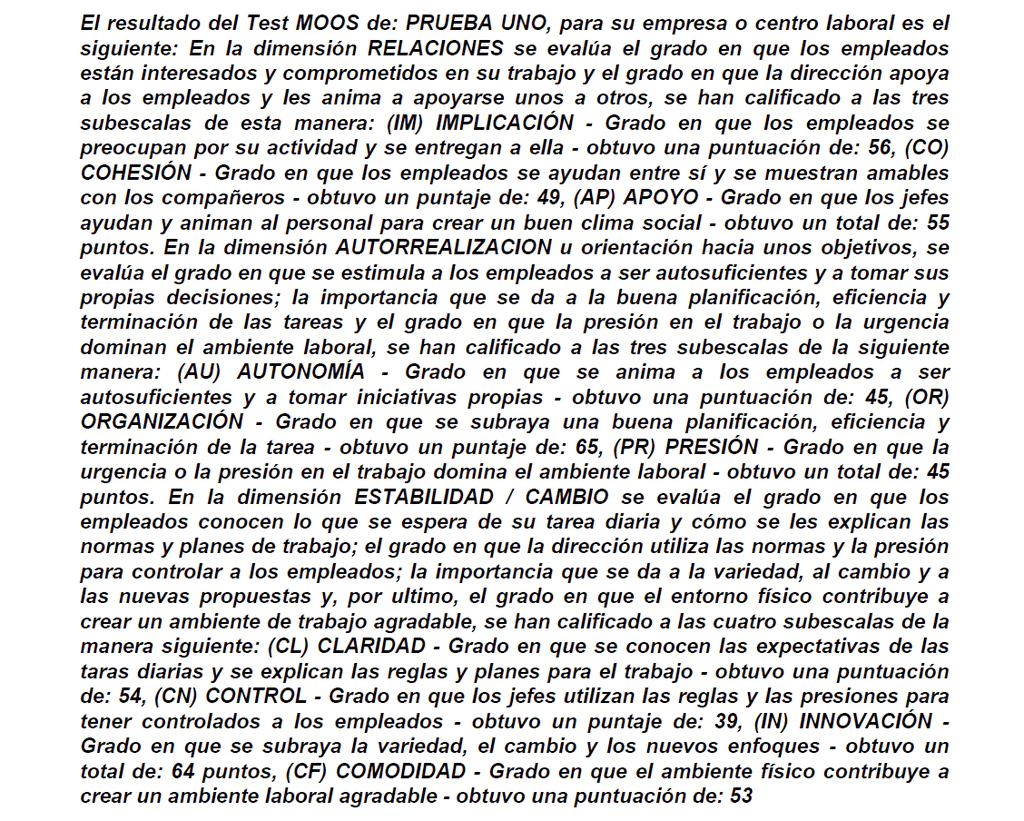 EL RESULTADO DEL TEST MOOS DE: PRUEBA UNO, PARA SU EMPRESA O CENTRO LABORAL ES EL SIGUIENTE: EN LA DIMENSIÓN RELACIONES SE EVALÚA EL GRADO EN QUE LOS EMPLEADOS ESTÁN INTERESADOS Y COMPROMETIDOS EN SU TRABAJO Y EL GRADO EN QUE LA DIRECCIÓN APOYA A LOS EMPLEADOS Y LES ANIMA A APOYARSE UNOS A OTROS, SE HAN CALIFICADO A LAS TRES SUBESCALAS DE ESTA MANERA: (IM) IMPLICACIÓN – GRADO EN QUE LOS EMPLEADOS SE PREOCUPAN POR SU ACTIVIDAD Y SE ENTREGAN A ELLA – OBTUVO UNA PUNTUACIÓN DE: 56, (CO) COHESIÓN – GRADO EN QUE LOS EMPLEADOS SE AYUDAN ENTRE SÍ Y SE MUESTRAN AMABLES CON LOS COMPAÑEROS – OBTUVO UN PUNTAJE DE: 49, (AP) APOYO – GRADO EN QUE LOS JEFES AYUDAN Y ANIMAN AL PERSONAL PARA CREAR UN BUEN CLIMA SOCIAL – OBTUVO UN TOTAL DE: 55 PUNTOS. EN LA DIMENSIÓN AUTORREALIZACION U ORIENTACIÓN HACIA UNOS OBJETIVOS, SE EVALÚA EL GRADO EN QUE SE ESTIMULA A LOS EMPLEADOS A SER AUTOSUFICIENTES Y A TOMAR SUS PROPIAS DECISIONES; LA IMPORTANCIA QUE SE DA A LA BUENA PLANIFICACIÓN, EFICIENCIA Y TERMINACIÓN DE LAS TAREAS Y EL GRADO EN QUE LA PRESIÓN EN EL TRABAJO O LA URGENCIA DOMINAN EL AMBIENTE LABORAL, SE HAN CALIFICADO A LAS TRES SUBESCALAS DE LA SIGUIENTE MANERA: (AU) AUTONOMÍA – GRADO EN QUE SE ANIMA A LOS EMPLEADOS A SER AUTOSUFICIENTES Y A TOMAR INICIATIVAS PROPIAS – OBTUVO UNA PUNTUACIÓN DE: 45, (OR) ORGANIZACIÓN – GRADO EN QUE SE SUBRAYA UNA BUENA PLANIFICACIÓN, EFICIENCIA Y TERMINACIÓN DE LA TAREA – OBTUVO UN PUNTAJE DE: 65, (PR) PRESIÓN – GRADO EN QUE LA URGENCIA O LA PRESIÓN EN EL TRABAJO DOMINA EL AMBIENTE LABORAL – OBTUVO UN TOTAL DE: 45 PUNTOS. EN LA DIMENSIÓN ESTABILIDAD / CAMBIO SE EVALÚA EL GRADO EN QUE LOS EMPLEADOS CONOCEN LO QUE SE ESPERA DE SU TAREA DIARIA Y CÓMO SE LES EXPLICAN LAS NORMAS Y PLANES DE TRABAJO; EL GRADO EN QUE LA DIRECCIÓN UTILIZA LAS NORMAS Y LA PRESIÓN PARA CONTROLAR A LOS EMPLEADOS; LA IMPORTANCIA QUE SE DA A LA VARIEDAD, AL CAMBIO Y A LAS NUEVAS PROPUESTAS Y, POR ULTIMO, EL GRADO EN QUE EL ENTORNO FÍSICO CONTRIBUYE A CREAR UN AMBIENTE DE TRABAJO AGRADABLE, SE HAN CALIFICADO A LAS CUATRO SUBESCALAS DE LA MANERA SIGUIENTE: (CL) CLARIDAD – GRADO EN QUE SE CONOCEN LAS EXPECTATIVAS DE LAS TARAS DIARIAS Y SE EXPLICAN LAS REGLAS Y PLANES PARA EL TRABAJO – OBTUVO UNA PUNTUACIÓN DE: 54, (CN) CONTROL – GRADO EN QUE LOS JEFES UTILIZAN LAS REGLAS Y LAS PRESIONES PARA TENER CONTROLADOS A LOS EMPLEADOS – OBTUVO UN PUNTAJE DE: 39, (IN) INNOVACIÓN – GRADO EN QUE SE SUBRAYA LA VARIEDAD, EL CAMBIO Y LOS NUEVOS ENFOQUES – OBTUVO UN TOTAL DE: 64 PUNTOS, (CF) COMODIDAD – GRADO EN QUE EL AMBIENTE FÍSICO CONTRIBUYE A CREAR UN AMBIENTE LABORAL AGRADABLE – OBTUVO UNA PUNTUACIÓN DE: 53